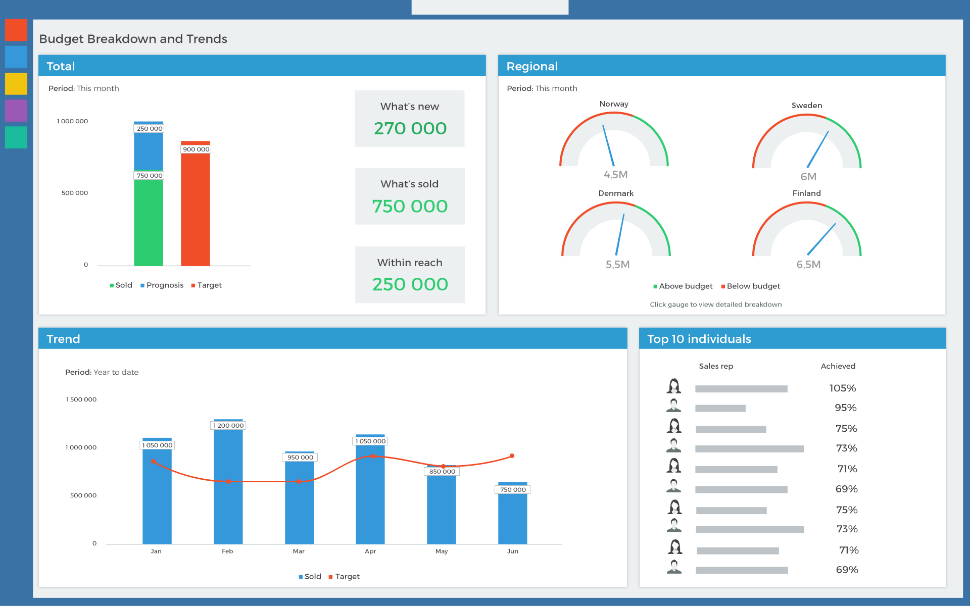 The dashboard should provide information on different levels from company-wide through to region, team or individual. This ensures the leaders have the facts they need make decisions while managers have can monitor progress and better coach their team.