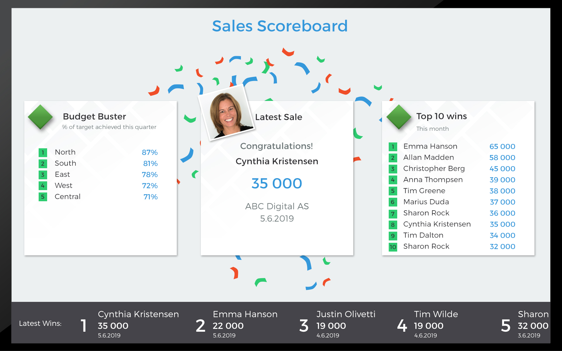 Scoreboards are specific types of dashboard which show the lstanding of a sales contest. Sales contests are a fun way to focus salespeople efforts around a common goal and boost activity levels.