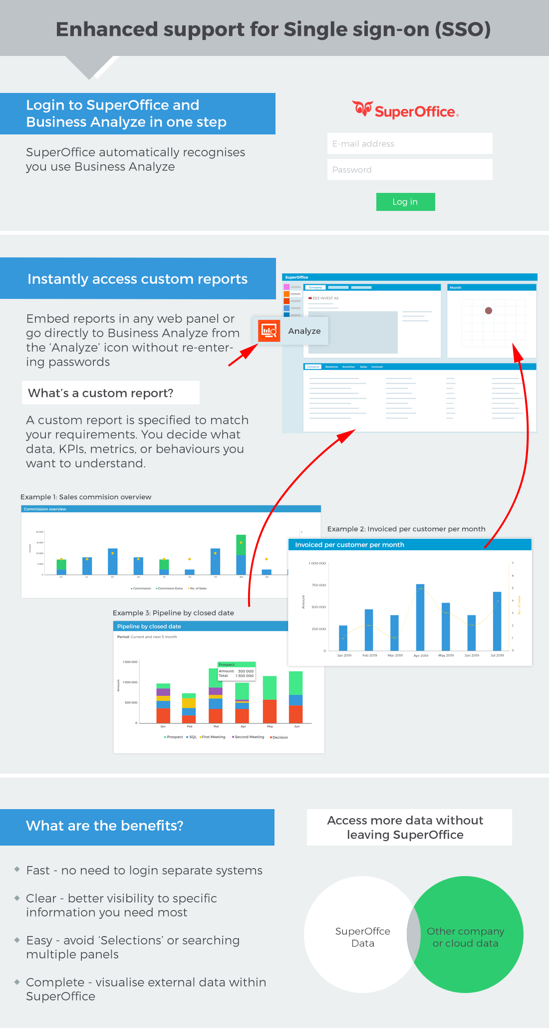 Our new enhanced support for Single-Sign On (SSO) means you can log into SuperOffice and instantly access Business Analyze advanced data analytics and reports, without having to remember separate passwords or login twice.