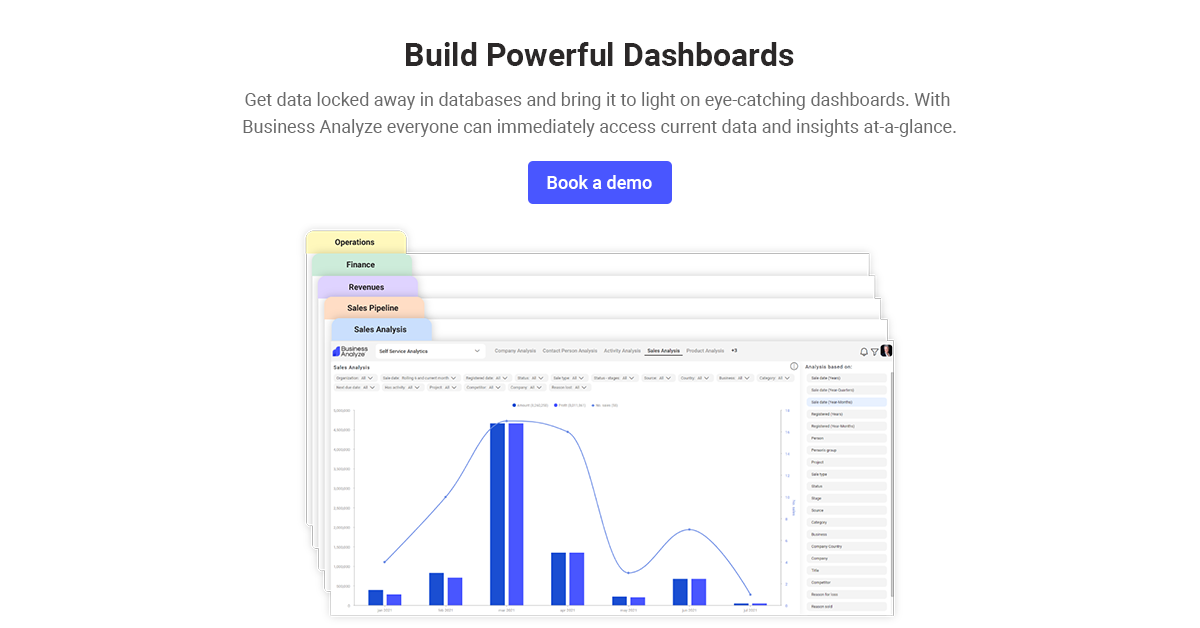 Build powerful strategic, operational or analytic dashboards. Business Analyze is loaded with features that enable designers and developers to quickly build, edit, and customise dashboards. Choose from a wide-range of interactive charts, graphs and maps, format the look and feel, and add multi-level drill-downs.