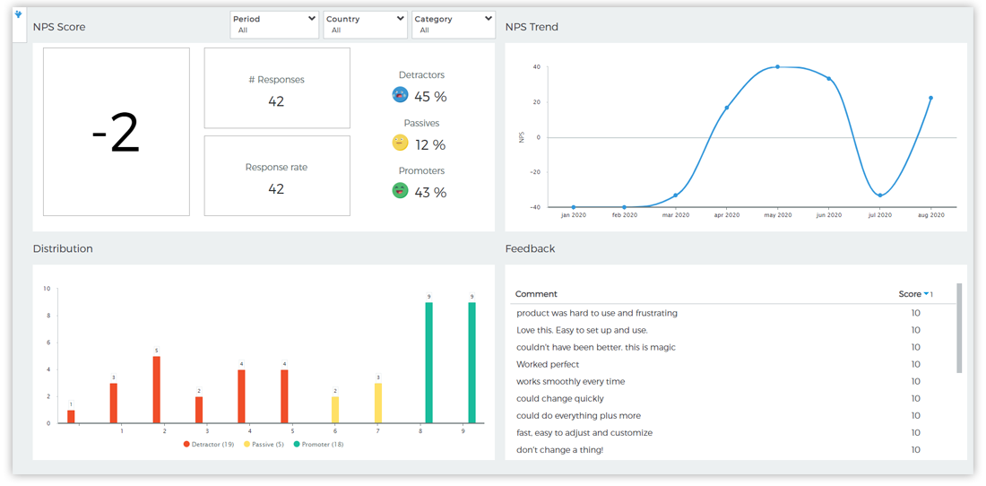 If NPS is one of several customer satisfaction metrics, it’s possible to group metrics on dashboards and analyze relationships between data.